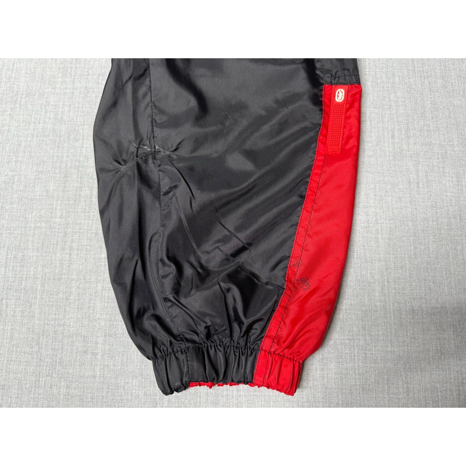 The hood string is missing one of the tips. There’s a few flaws on the sleeve.